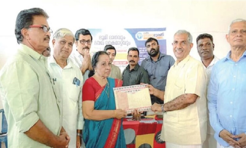 In a ceremony held at the Devikshetra auditorium in Padippurakkal, Champakulam, Rajamma Balarajan presented the title deed of 98 cents of her land and a house to RSS Sabarigiri Vibhag Sanghachalak CP Mohanachandran. Deseeya Seva Bharati Kerala Vice President Dr. Krishnan Namboothiri honored Rajamma with a Mangalapatram (certificate of gratitude) in recognition of her contribution to Seva Bharati.