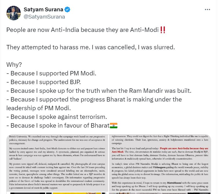 Now Satyam Surana, Another Bharatiya Student alleges hate campaign against him during college elections