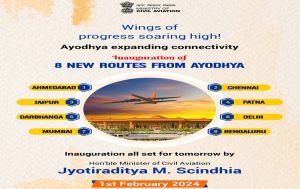 The immense demand emanating from the recent Pran Pratishtha ceremony at Ram Mandir as increased the tourism potential of Ayodhya and laid down a new path for economic and social development. The flight services will be inaugurated by Union Minister of Civil Aviation Jyotiraditya Scindia and Spice Jet will operate on these flight routes.