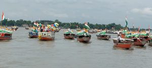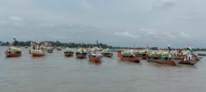 The Dhubri boat rally, organised in collaboration with the BSF and State police, marched from Kachari Ghat to Chalakura Char (river island) with well-equipped 75 machine boats, designed with the three colours national flags & balloons and returned back. Dhubri district magistrate Anbamuthan MP took the initiative to spread awareness among the people living in vast Dhubri Char-areas, bordering Bangladesh.